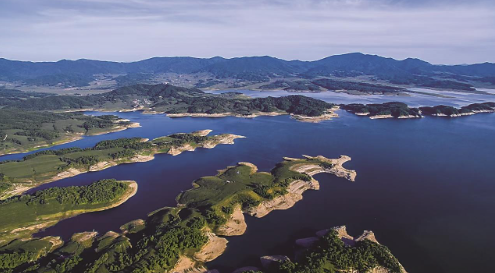 夏日的松花湖,蓝天白云倒映在碧波荡漾的湖面上,构成了一幅绝美的自然画卷。